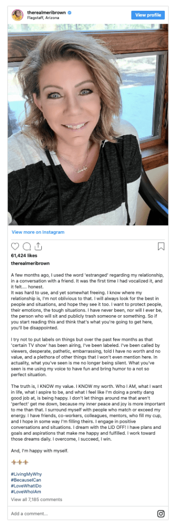 Le 10 janvier 2023, Méri et Kody a publié une déclaration commune sur les réseaux sociaux annonçant la fin de leur mariage. La déclaration mettait en évidence leur parcours de plus d’une décennie, travaillant sur leur relation de manière unique, et leur décision de mettre définitivement fin à leur relation conjugale. Ils ont souligné leur engagement envers la gentillesse et le respect les uns envers les autres et envers leur famille, en se concentrant sur la guérison et en allant de l’avant avec le pardon, la grâce et l’amour.