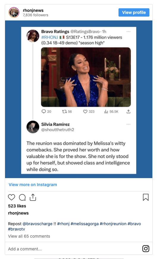 Selon l’explication du compte Twitter, une fois Mélisse a réalisé son erreur, le restaurant a rapidement supprimé le message, puis a republié la même photo exacte et l’a taguée de Melissa Gorga poignée Instagram officielle. «Puis, quand elle a réalisé qu’elle avait donné au restaurant son finsta, ils l’ont supprimé et l’ont taguée. Pourquoi un restaurant taguerait-il un compte de fan au hasard? » @Melissa’sOldNose a ajouté.