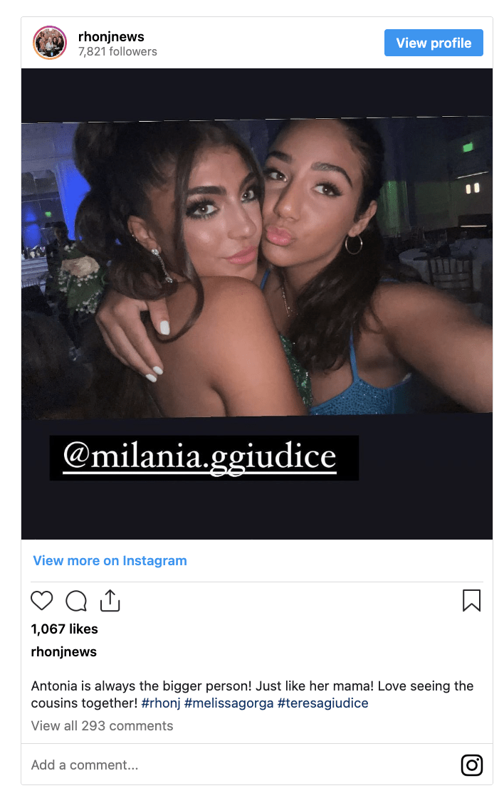 L’allégation est apparue après Les vraies femmes au foyer du New Jersey la fille de la star, Antonia Gorga, cassé un doux selfie d’elle-même et de sa cousine, Milania Giudice, à leur bal de fin d’année. Elle a ensuite posté la photo sur Instagram, malgré la vilaine querelle de la famille, qui a provoqué une division entre les cousins. La photo a été republiée par un compte de fan Instagram @rhonjnews, avec la légende : « Antonia est toujours la plus grande ! Tout comme sa maman ! J’adore voir les cousins ensemble ! #rhonj #melissagorga #teresagiudice.