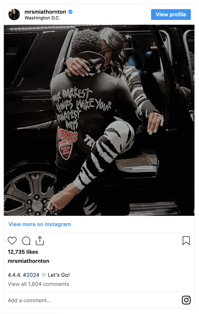 Mia Thornton, 39 ans, a officialisé sa relation sur Instagram dimanche, partageant une photo avec son nouvel homme dans une étreinte sexuelle. Curieusement, elle a sous-titré l’image « 4.4.4 » nous disant qu’elle se marie le 4 avril 2024, date importante. Son message comprenait également les mots enthousiastes « Allons-y ! » suivi de « 2024 ».