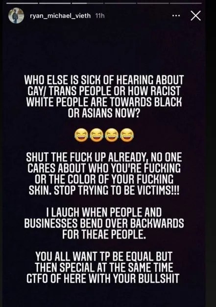 Et puis il y a eu cette fois où Ryan V s’est déchaîné homophobe/transphobe/anti-noir/anti-asiatique sur ses histoires Instagram. Oui, ceux-ci finissent par disparaître mais Internet n’oublie jamais !